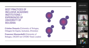 The second presentation was given by Associated Professor Francesco Mazzucchelli and Professor Cristina Demaria from the University of Bologna. Their talk, Best Practices of Inclusive Academic Institutions / Experiences of Bologna, provided an extensive overview of how equality and inclusion are supported at the University of Bologna through strategic planning, administrative structures, and programs designed to foster diversity at all levels of academia. They reminded that universities do not exist in isolation from society. While it is important to reinforce diversity in strategic planning, it is equally vital to implement guidelines through concrete actions and foster dialogue about the challenges and opportunities that universities may face in the future.